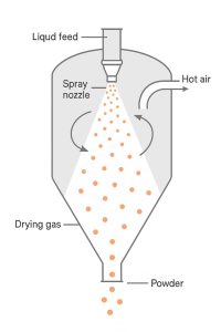 In this type of dryer, the air is blown co-currently with the sprayed liquid. This method typically produces powders with fine particle sizes.